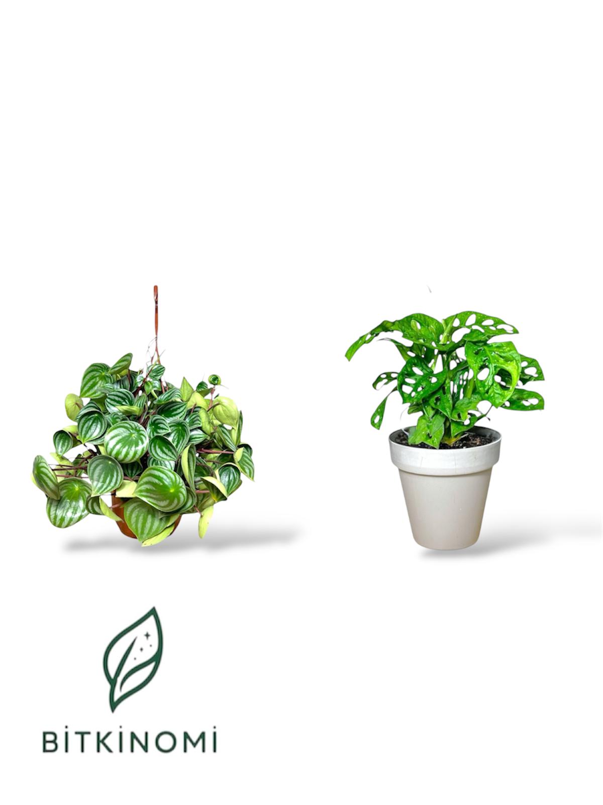 Peperomia Watermelon–Monstera Monkey Mask, iki özel iç mekân bitkisini bir araya getirerek dekorasyona hem modern hem de enerjik bir hava katmak isteyenler için özenle hazırlanmıştır. Dairesel yaprak desenleriyle öne çıkan Peperomia Watermelon, masif görüntüsü ve kompakt formuyla dekoratif etki sağlar. Ona eşlik eden Monstera Monkey Mask, delikli yaprak yapısıyla ortama hareket, modern hat ve tropik bir görünüm kazandırır.